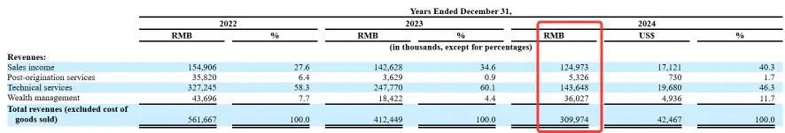2024年,玖富的三大业务,技术服务(助贷)、电商销售与财富管理,两降一增。