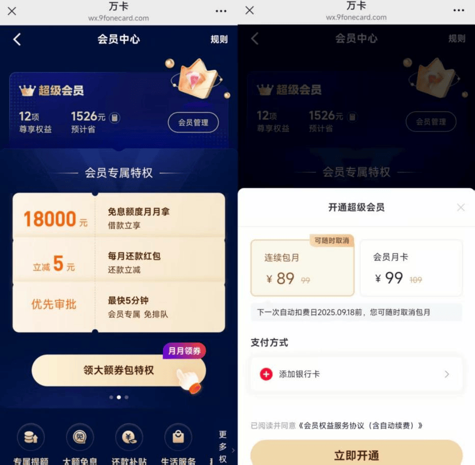 除此之外,玖富万卡还向用户提供会员权益服务,从下方的“超级会员”入口进入,页面展示了会员拥有还款补贴、免息额度、一对一客服,以及生活服务等专属特权。