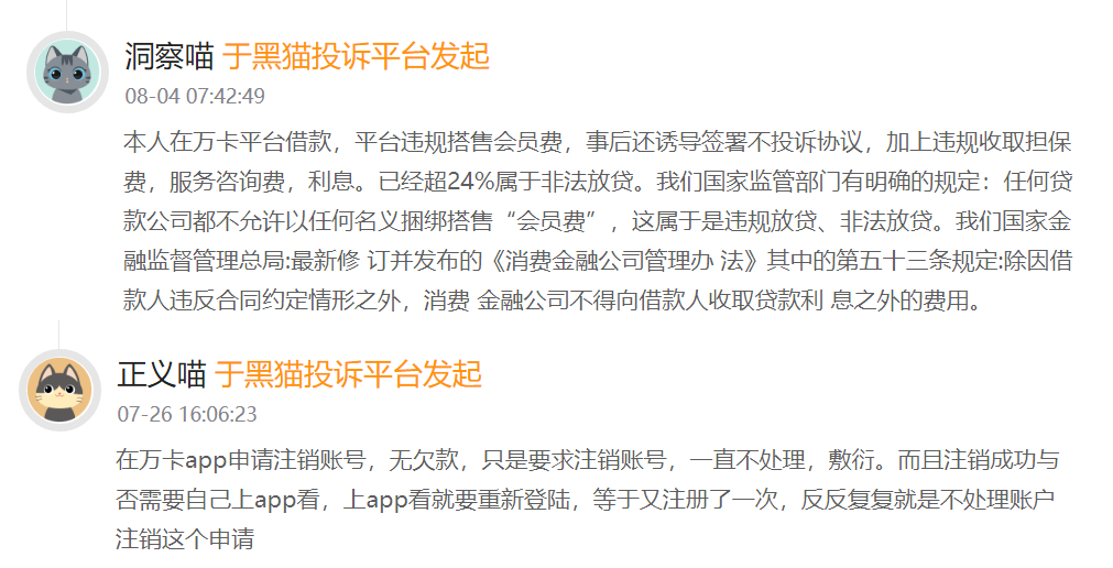 另一位用户也被类似的境遇所困扰,发文称:在万卡平台借款,平台违规搭售会员费,事后还诱导签署不投诉协议,加上违规收取担保费,服务咨询费,利息,已经超24%,属于非法放贷。