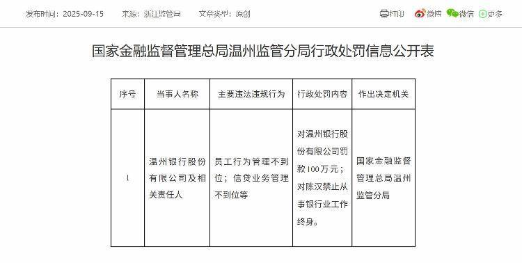 根据国家金融监督管理总局发布的行政处罚通告,因员工行为管理不到位,信贷业务管理不到位等违法违规行为,温州银行被罚款100万元,相关责任人陈汉被处以终身禁业的严厉处罚。