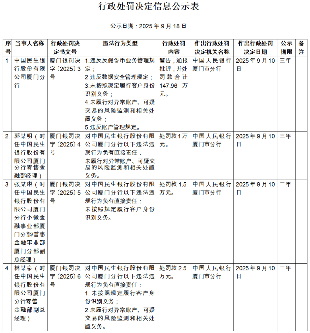 近日,央行厦门市分行行政处罚信息公示表显示,民生银行因为存在违反反假货币业务管理规定;违反数据安全管理规定;未按照规定履行客户身份识别义务;未履行对异常账户、可疑交易的风险监测和相关处置义务;违反账户管理规定五项违法违规行为,被警告,通报批评,并处罚款合计147.96万元。