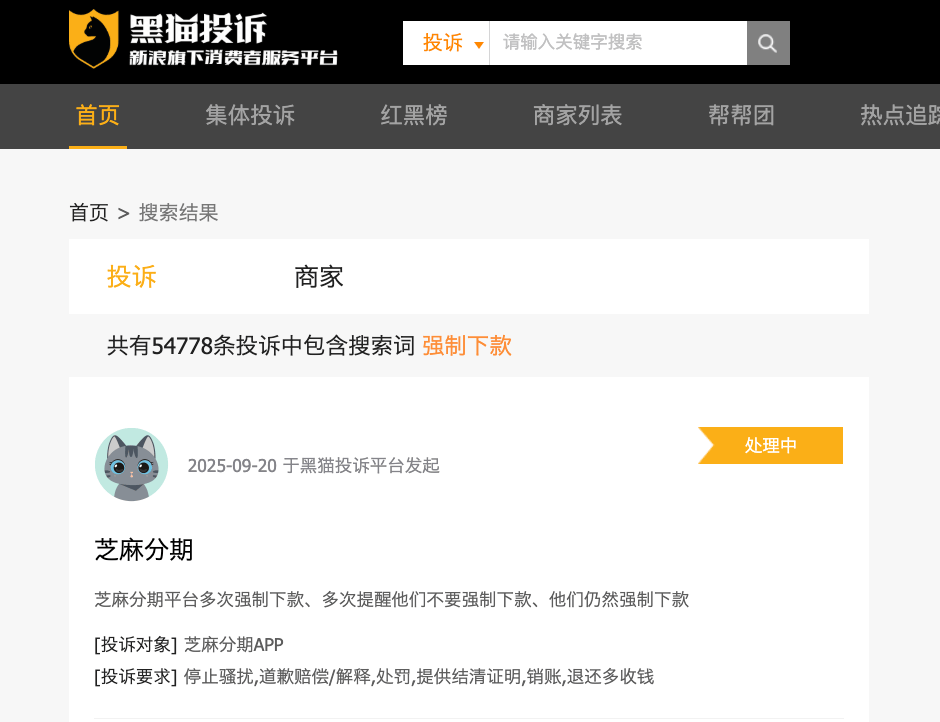 这样的案例并不鲜见。据柒财经调查,近两个月来,地下高炮平台的活跃度显著提升,像张明这样的受害者不在少数,黑猫投诉平台显示,以“强制下款”为关键词,搜索结果多达54778条,其中绝大多数,基本都与张明的情况类似。