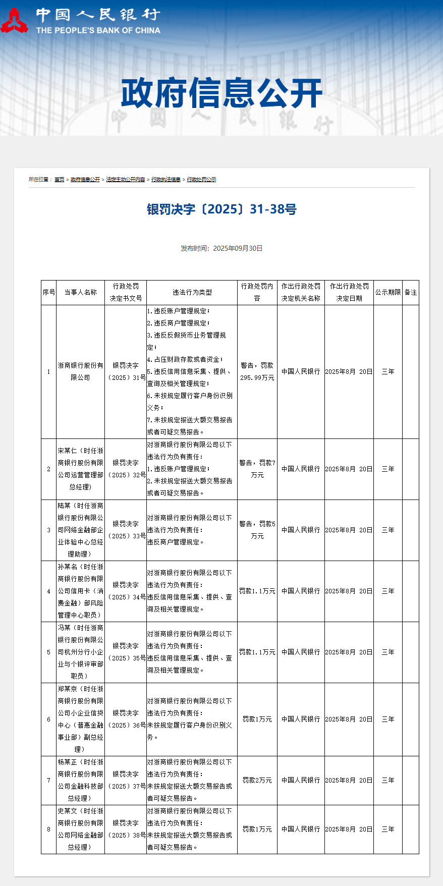 近日,央行发布行政处罚信息,浙商银行因为存在“违反账户管理规定”“违反商户管理规定”“违反反假货币业务管理规定”“占压财政存款或资金”“违反信用信息采集、提供、查询及相关管理规定”“未按规定履行客户身份识别义务”“未按规定报送大额交易报告或者可疑交易报告”共七项违法违规行为,被处以警告并罚款295.99万元。
