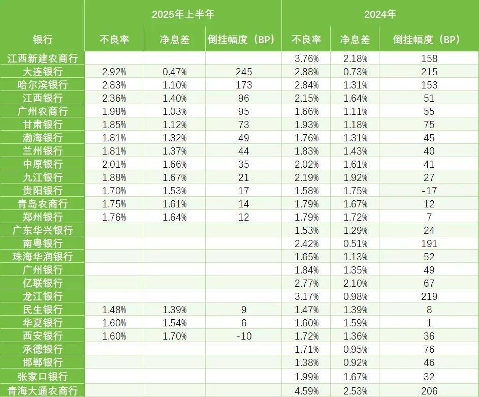 若回溯2024年,行业净息差和不良率“倒挂”的面积更大。除了上述选手,还包括江西新建农商行、贵阳农商行、广东华兴银行、亿联银行、西安银行等。