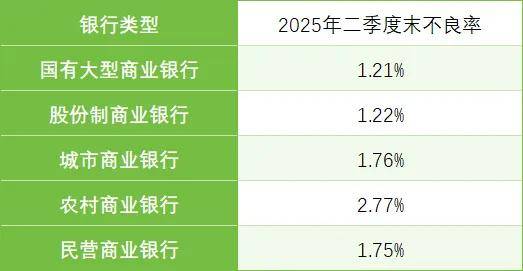国家金监总局的数据印证,截至2025年二季度末,商业银行的不良率1.49%。其中,国有大行为1.21%、股份行为1.22%、城商行为1.76%、民营行1.75%、农商行高达2.77%。