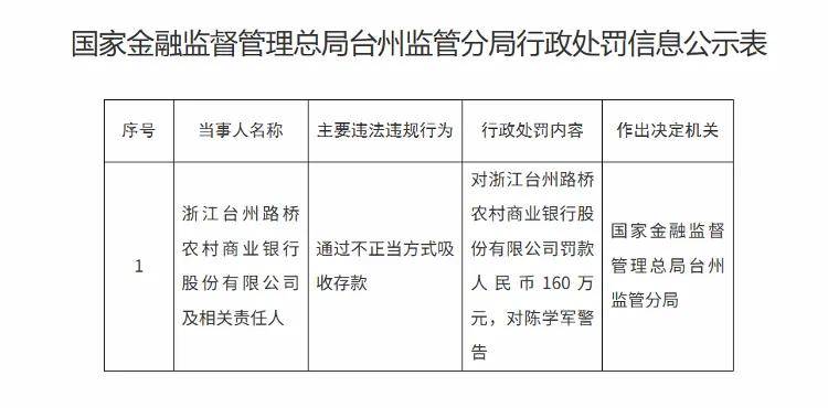 同月,浙江台州路桥农商行也因不正当方式吸收存款,被监管重罚160万元。