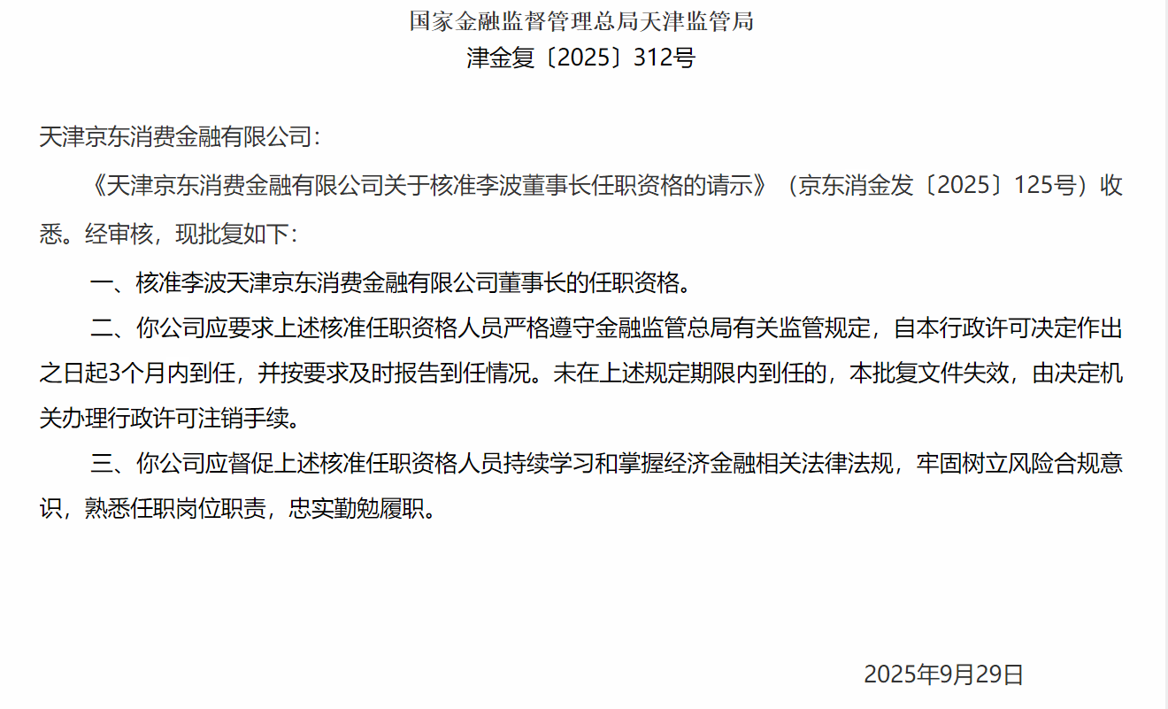 近日,国家金融监督管理总局天津监管局发布批复,正式核准李波担任天津京东消费金融有限公司(以下简称“京东消金”)董事长的任职资格。