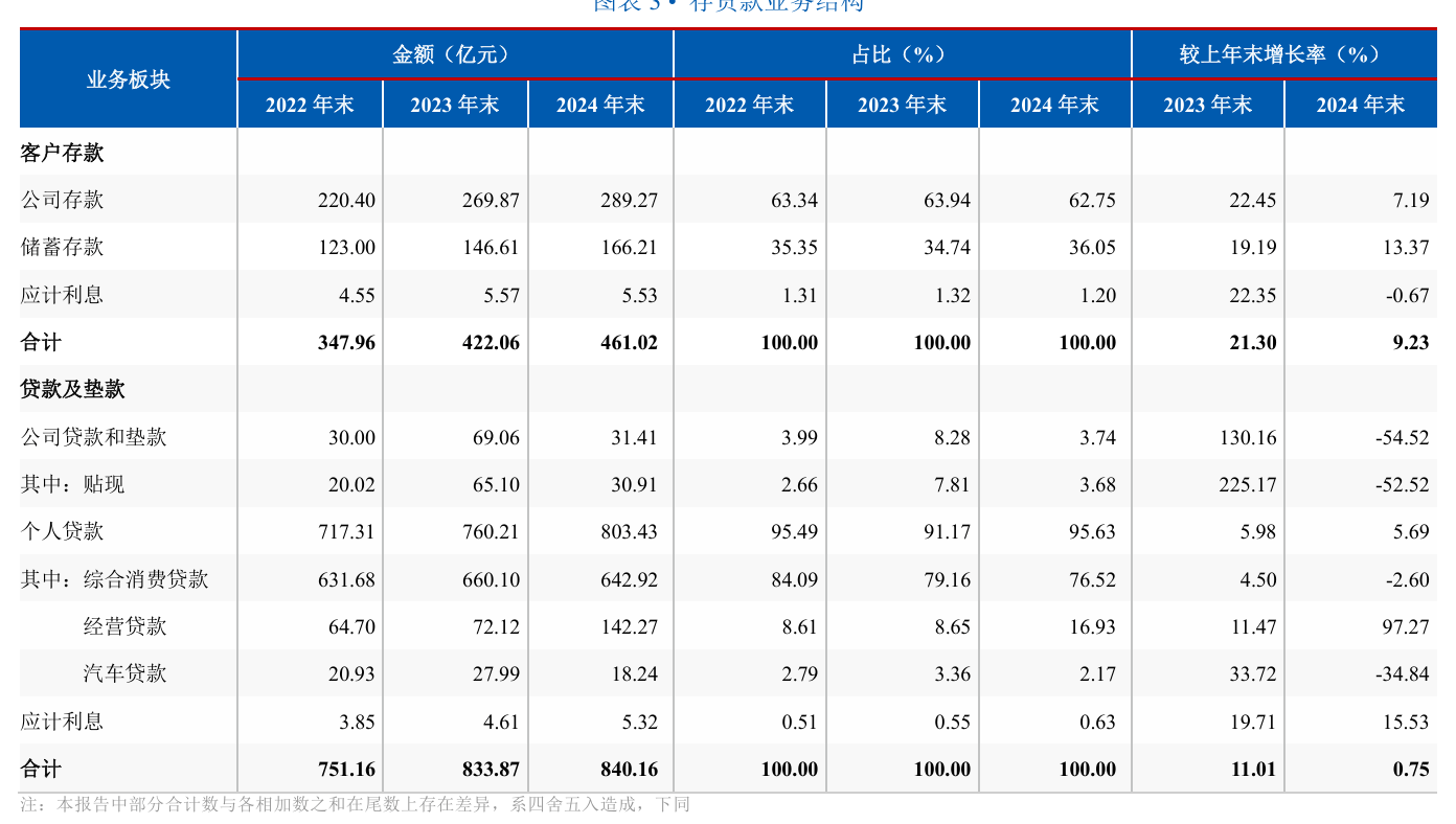 根据联合资信的评级报告,截至2024年末,该行个人消费贷款余额为642.92亿元,占总贷款比重为76.52%。个人经营贷款余额142.27亿元,占总贷款比重为16.94%。