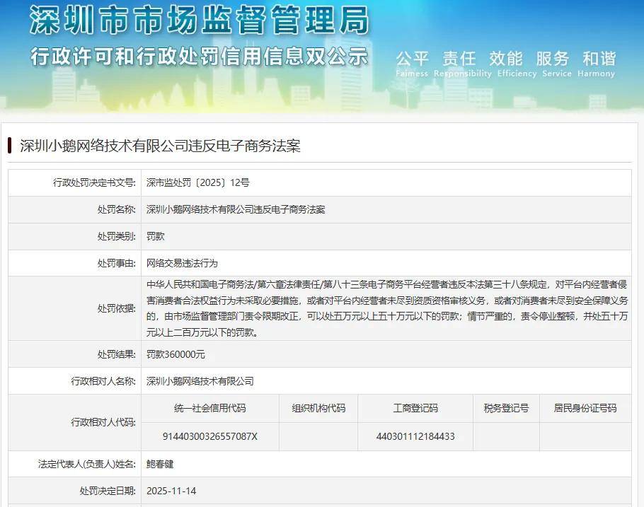 根据深市监处罚〔2025〕12号处罚决定书,小鹅公司在运营过程中,存在网络交易违法行为,被处罚款36万元。