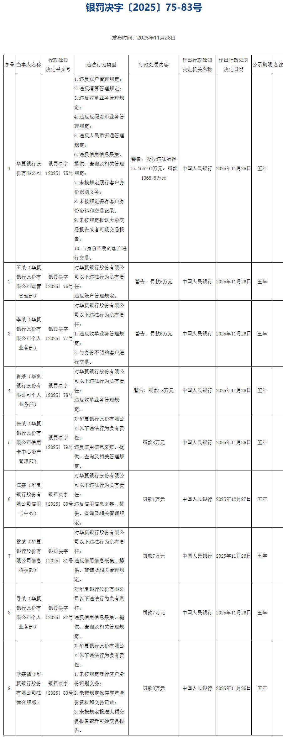 11月28日,央行凯发k8官网披露的行政处罚信息显示,因为存在违反账户管理规定;违反清算管理规定;违反收单业务管理规定;违反反假货币业务管理规定等十项违法违规行为,华夏银行被予以警告,没收违法所得15.456791万元,并处以1365.5万元罚款,合计罚没金额高达1380.96万元。