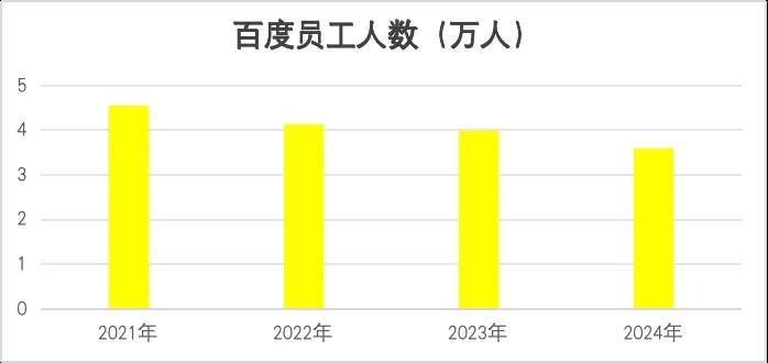 财报显示,截至2024年年底,百度员工总数为3.59万人,相较2023年的3.98万人和2022年的4.13万人,分别减少约4000人、5400人;相较2021年历史峰值的4.55万人,减员近万人,整体降幅超过21%。