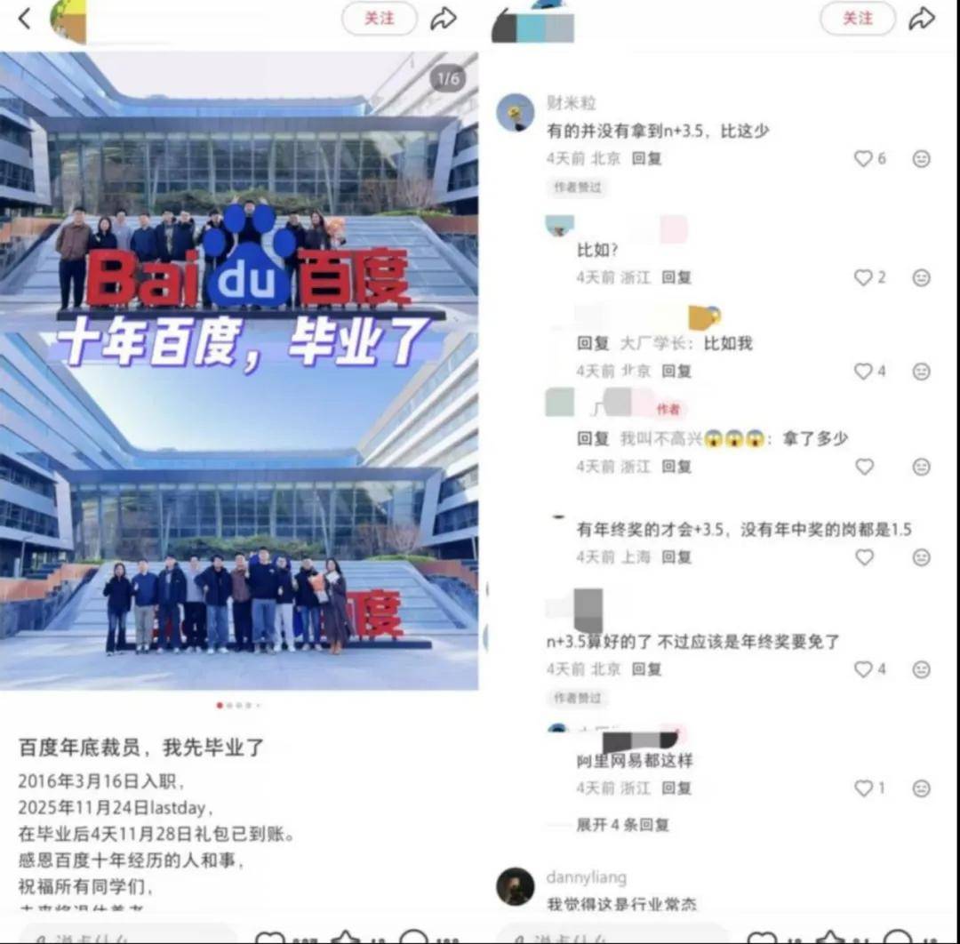也有自称是25届应届生、仅入职百度3个月的员工在社交平台发文,其在移动生态事业群组部门的赔偿是n 1.5。