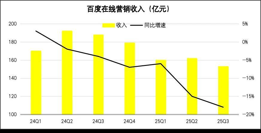 分板块看,百度的“基本盘”和现金流支柱,即在线营销正面临失守局面,q3收入(广告收入)为153亿元,同比大幅缩水18%。