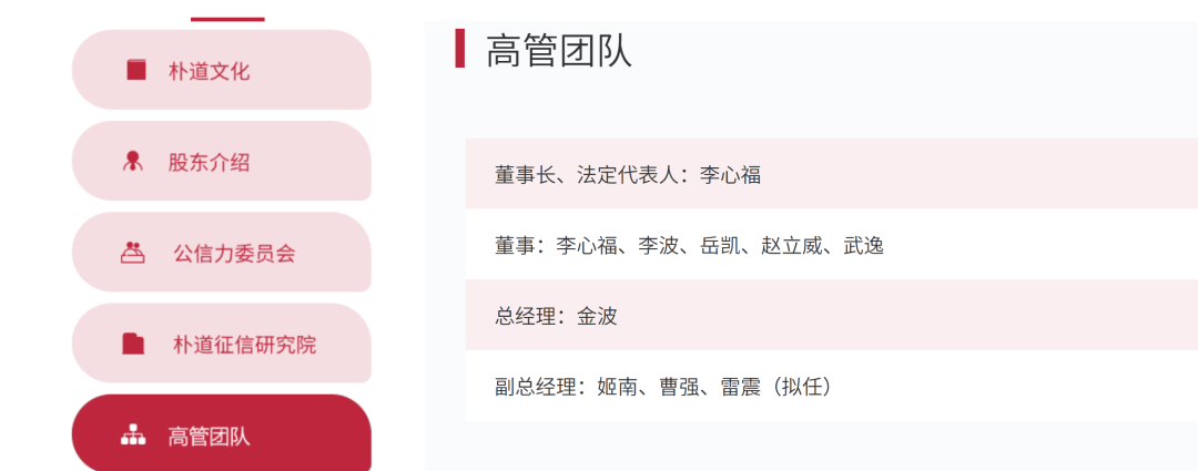 同时,朴道征信凯发k8官网也对高管团队进行了更新:董事长李心福、总经理金波及三名副总经理姬南、曹强、雷震(拟任),构成核心管理层。