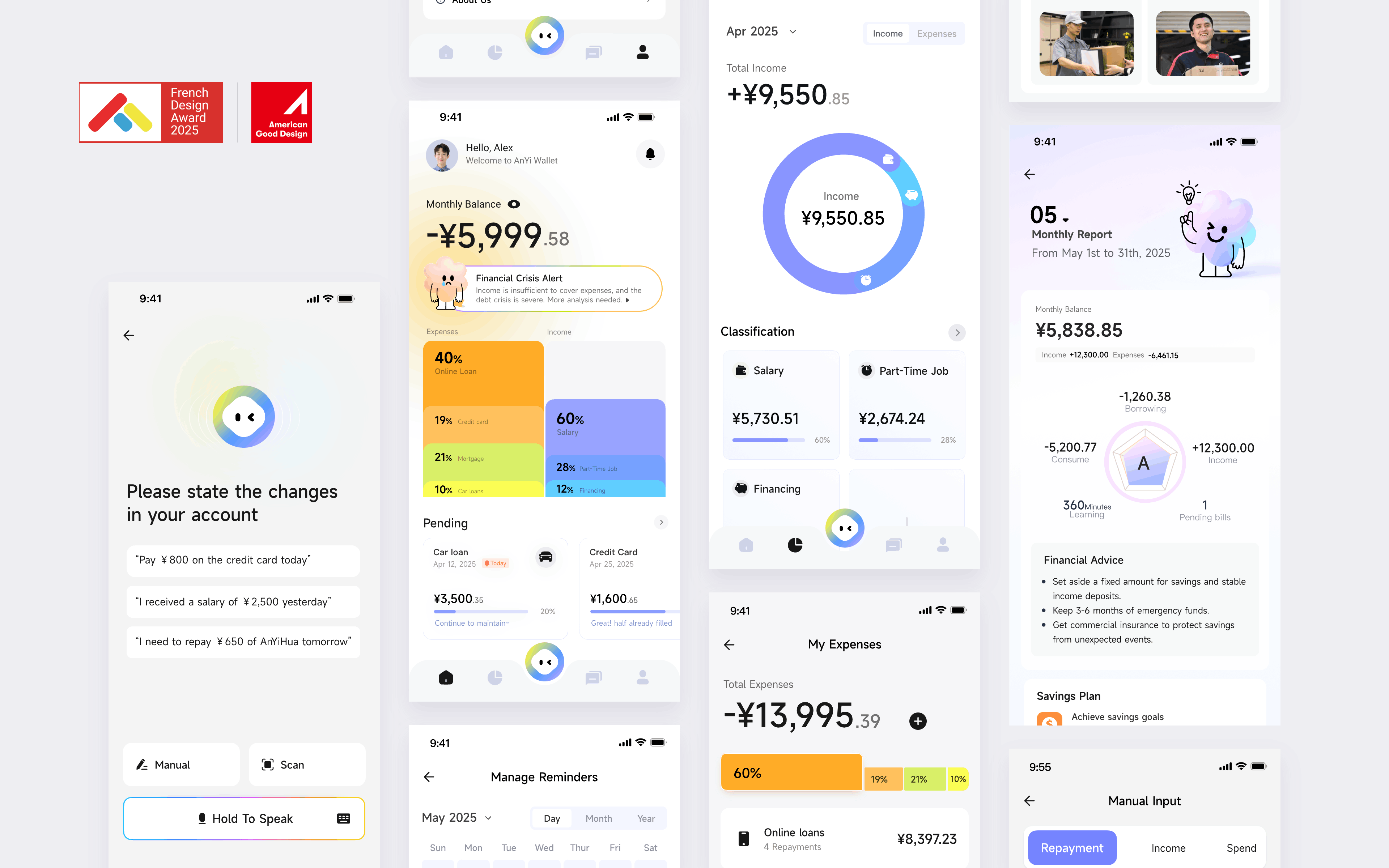 在金融服务领域,马上消费获奖案例“安逸账本”,聚焦借款用户“多账务管理” 的核心痛点:一些用户因短期资金周转不善导致财务管理承压,进而面临债务风险。为此,设计团队专为这类用户打造专属记账工具,聚焦 “收支清晰化、平衡预警化”,以设计消解账单焦虑、破解财务信息碎片化难题。秉持 “收支同步记录,精准平衡管控” 理念,通过直观简洁的交互界面让用户实时掌控收支;当支出即将超出收入时,系统自动触发提醒并推送个性化财务建议,更联动优质资源对接兼职及职业转换机会,助力用户从根源改善财务状况、实现资金良性周转。