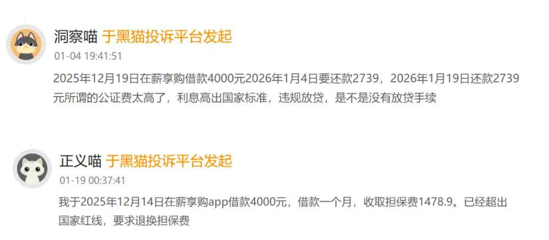 有用户表示,2025年12月19日在薪享购借款4000元,2026年1月4日要还款2739,2026年1月19日还款2739元。所谓的公证费太高了,利息高出国家标准。