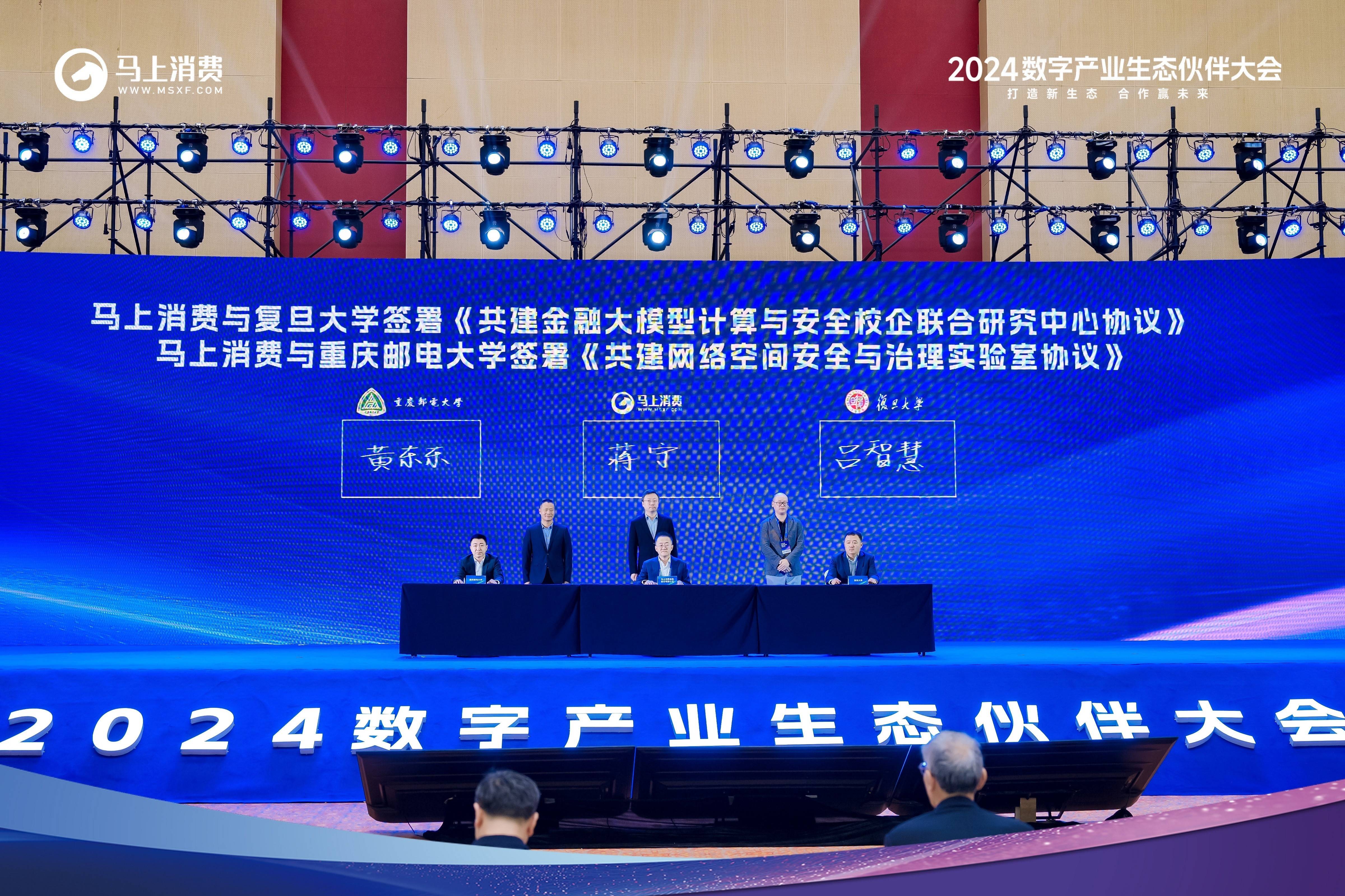 在与复旦大学、重庆邮电大学签署合作框架协议环节,重庆市科学技术局党委委员、副局长韩鹏,马上消费金融股份有限公司董事长赵国庆、重庆邮电大学党委副书记许光洪的见证下,马上消费常务副总经理蒋宁,复旦大学金融科技研究院副院长、ccf 数字金融分会副主任吕智慧,重庆邮电大学网络空间安全与信息法学院副院长黄东东代表各方签署合作协议。