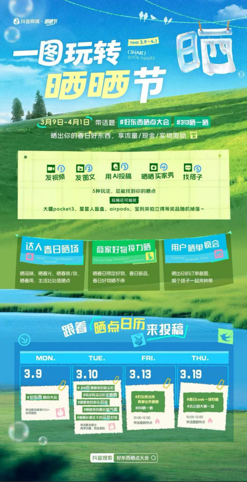 为助力春日消费,3月9日,抖音电商正式上线“晒晒节”活动,邀约平台用户、创作者与商家一同参与,激活优质内容生态,助力电商好物被更多人看见,实现内容与生意的双增长。参与者通过分享优质好物内容,即可有机会获得流量扶持、现金奖励、精选好物、创作分成等多重激励。本次活动将持续至4月1日结束。