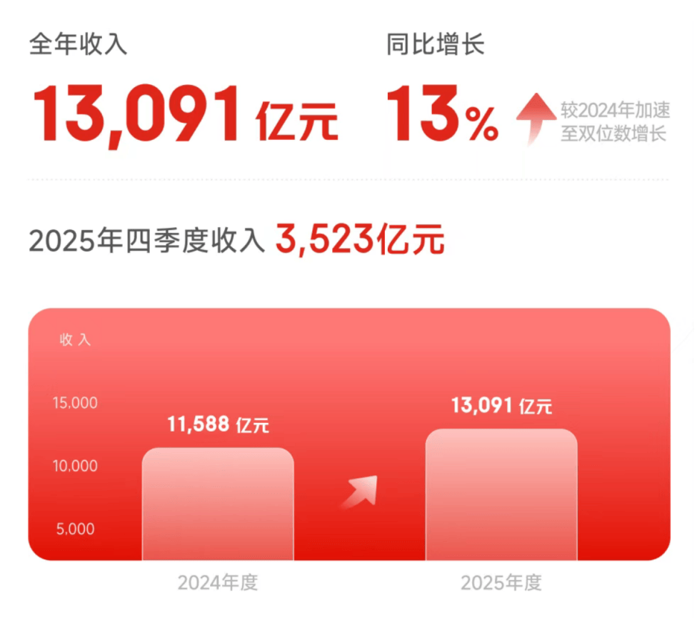 3月5日,京东集团公布了2025年四季度及全年业绩:全年收入13,091亿元,增速从2024年的6.84%拔高至12.97%;年度活跃用户数扩大至超7亿,季度活跃用户数和用户购物频次同比增长超30%。