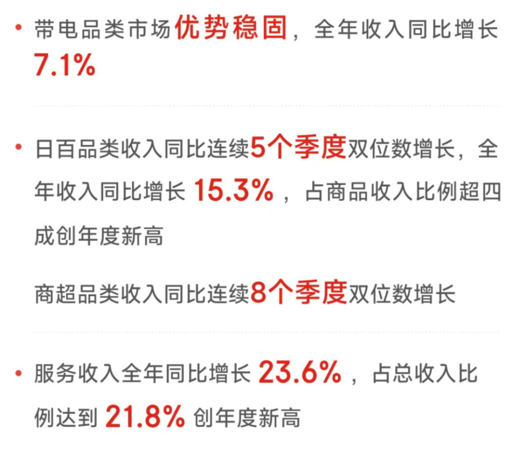 具体来看,带电品类在去年高基数的基础上,市场优势继续巩固,增速达到7.1%;日百品类连续5个季度双位数上扬,全年收入同比增长15.3%;服务收入同比增长23.6%,营收占比扩大至21.8%,创年度新高。