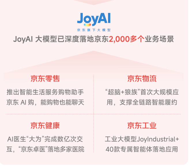 高强度投入下,joyai大模型融入各生态,为各业务供给效能:物流场景,“超脑 狼族”首次大规模应用,支撑全链路智能履约;健康领域,ai医生“大为”已累计交互数亿次,医院ai产品“京东卓医”落地多家医疗机构,让偏远地区用户也能享受专业健康咨询;零售板块,ai导购助手年活跃用户突破1.5亿,带动数十亿gmv;工业领域,京东工业大模型joyindustrial 40款专属智能体,实现海量垂直“数据”和细分行业“场景”的有机结合。
