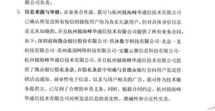 陈女士表示,“打官司的过程中,微众银行提出了各种和解条件,都被我拒绝了。借贷关系和侵权是两回事,不能用减免利息、免除债务来掩盖违法催收、泄露个人信息的事实。”面对陈女士的起诉,6家短信服务商在答辩中均称,公司与微众银行有合作关系,是微众银行提供了借款人的个人信息和短信内容,公司只是提供了短信通道。但据公开调查报道,上述公司均无法提供与微众银行直接签订的合作合同,也未能出具完整的授权链条证据,其业务均经历多轮转包。